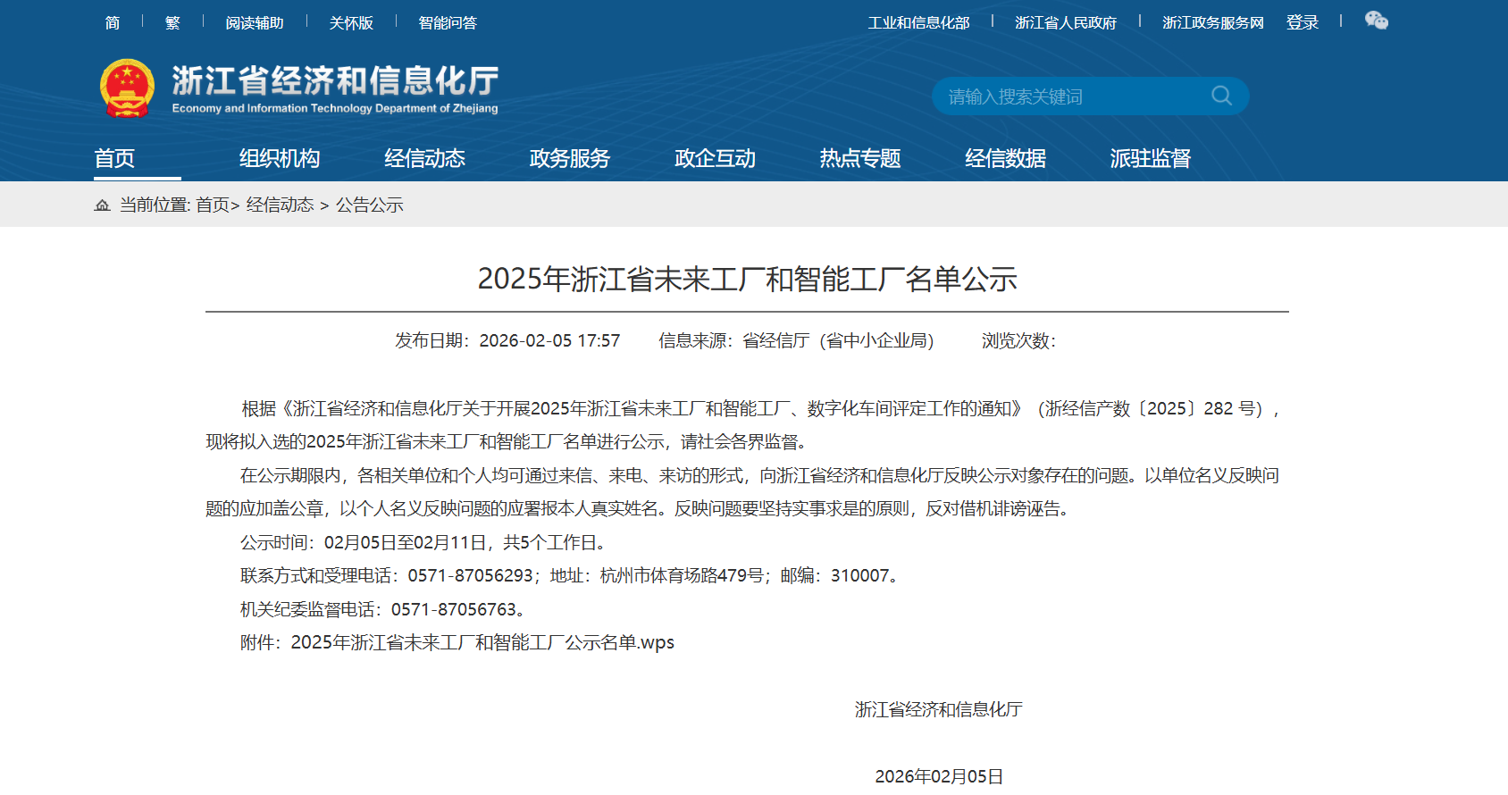 近日,浙江省经济和信息化厅正式公布了2025年度浙江省智能工厂项目名单,宁波水表(集团)股份有限公司(以下简称“宁水集团”)凭借“宁水集团智能水表智能工厂”项目成功入选。此次获评不仅是权威部门对宁水集团智能制造实力的高度认可,更是宁水集团以系统化、前瞻性的数字化转型蓝图为引领,扎实推进智能化建设的标志性成果展现。