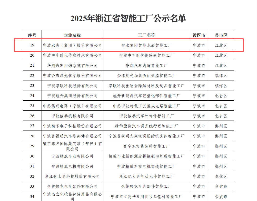 近日,浙江省经济和信息化厅正式公布了2025年度浙江省智能工厂项目名单,宁波水表(集团)股份有限公司(以下简称“宁水集团”)凭借“宁水集团智能水表智能工厂”项目成功入选。此次获评不仅是权威部门对宁水集团智能制造实力的高度认可,更是宁水集团以系统化、前瞻性的数字化转型蓝图为引领,扎实推进智能化建设的标志性成果展现。